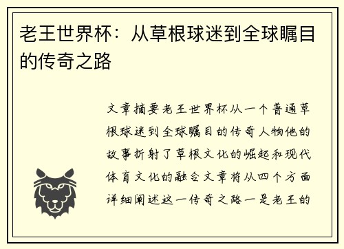 贝勒世界杯传奇之路:从少年天才到全球足球偶像的辉煌征程,讲述了贝勒如何从一个天赋异禀的年轻球员,一步步成长为世界足坛的标志性人物。文章将从贝勒的足球天赋、成长历程、世界杯征战、以及他成为全球足球偶像的过程,深入探讨这位超级球星的传奇之路。贝勒不仅通过自身的努力和天赋打破了足球的传统界限,还在多个世界...